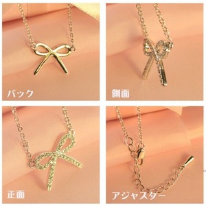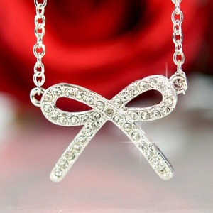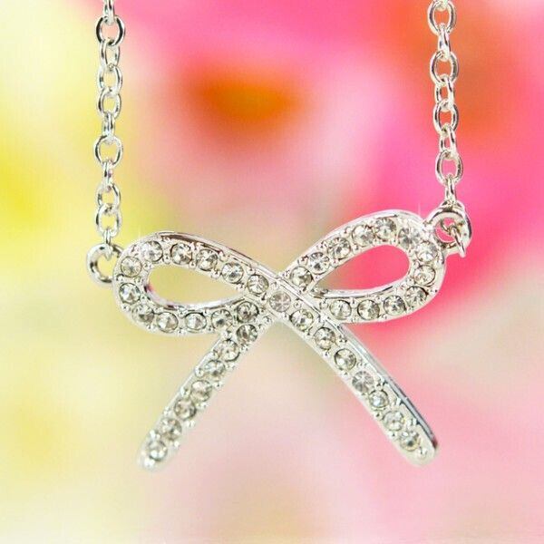 たくさんのスワロフスキーをあしらったリボンモチーフのネックレス大きめのリボンで可愛さが増す事間違いなし!いつまでもかわいくいたいあなたのための商品です!