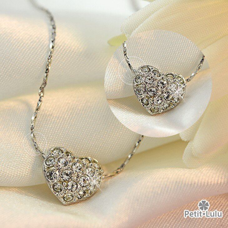 ぷっくりとしたハートモチーフが可愛らしいネックレスです。パヴェ状にスワロフスキーを敷き詰めた、ころんとした丸みのあるフォルムにはほどよい存在感があり、愛らしい女性を演出するには最適のネックレスです。チェーンはしなやかで張りのあるスェッジチェーンにねじりを入れ、上品な輝きをプラス。暖かみを感じさせるほんのりホワイトを帯びた輝きのハートモチーフとともに胸元に華やかさを添えることができます。