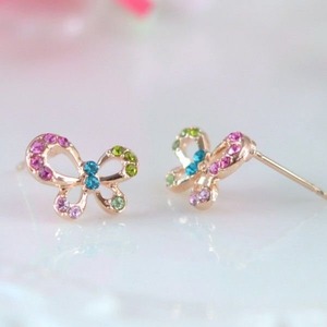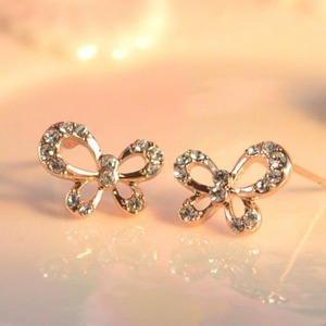 蝶々がスワロフスキーの模様をつけて耳元をひらひら羽ばたいているようなピアスです。
