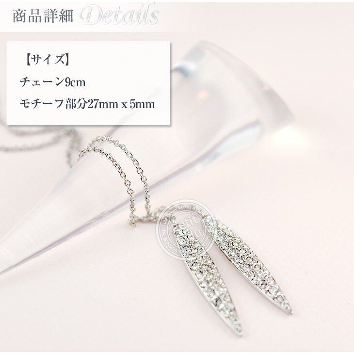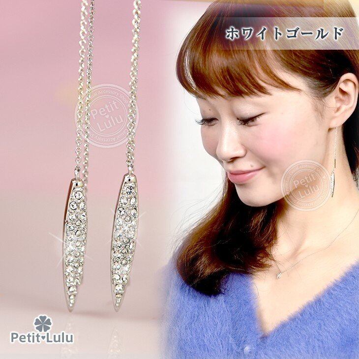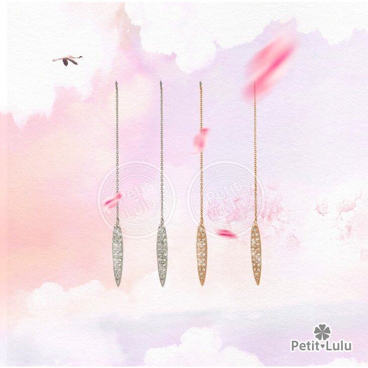 小顔効果が期待できる長めのチェーンに、さらに縦ラインを強調したモチーフ。細かなパヴェセッティングのスワロフスキーが優しく輝くリーフの揺れ感を楽しめる大人ピアスとなっています。