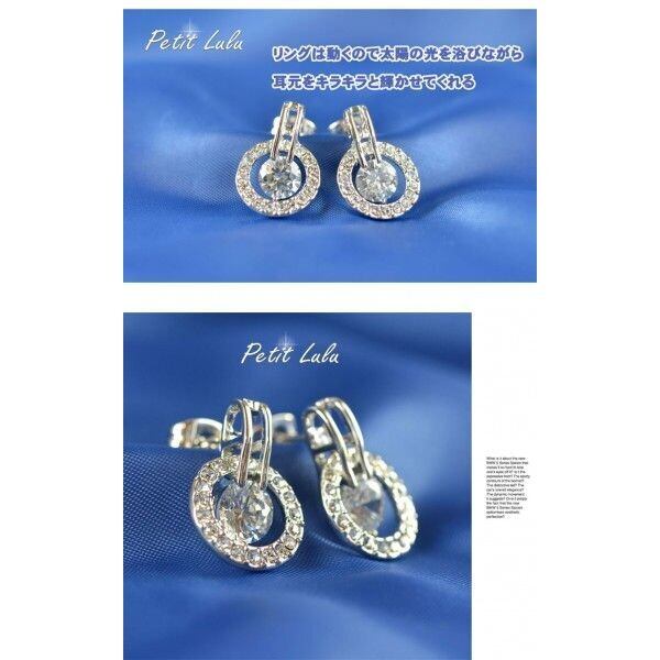 光り輝く一粒ダイヤの周りをたくさんのダイヤをちりばめたリングで囲いました。リングは動くので太陽の光を浴びながら耳元をキラキラと輝かせてくれること間違いなしの商品となっております。